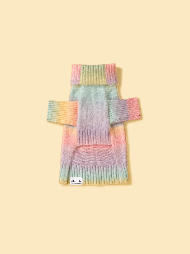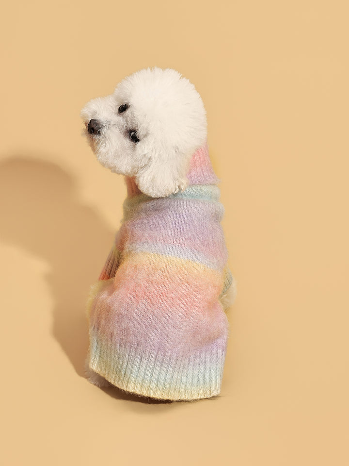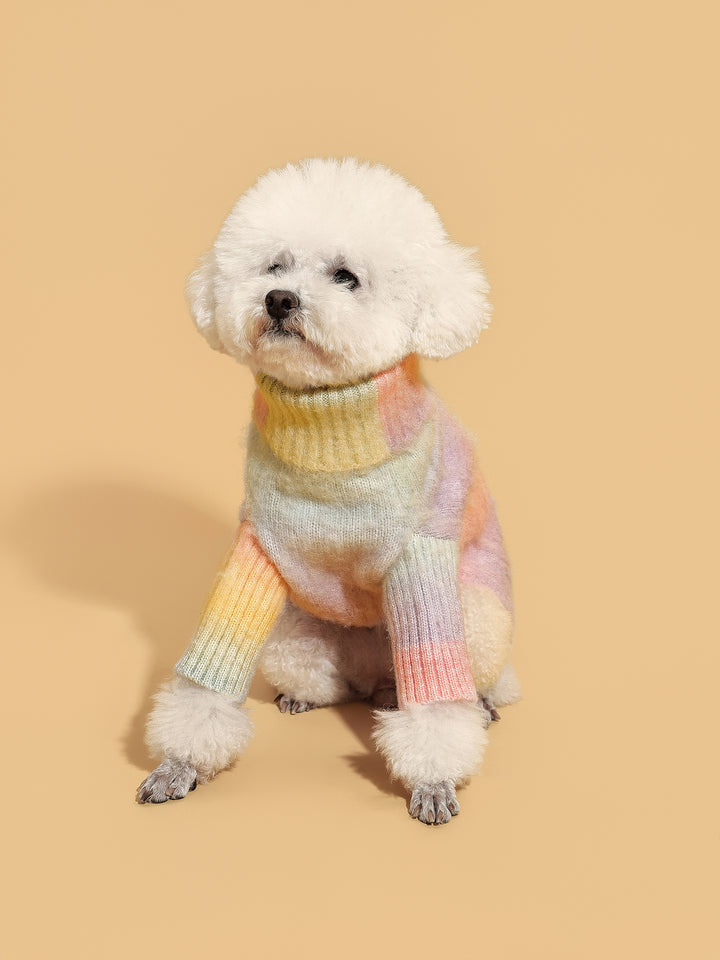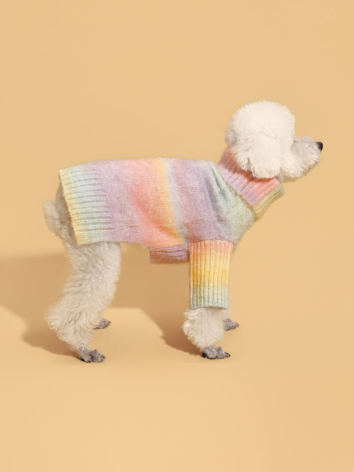 Enter the Ombre Rainbow Turtleneck Sweater: a playful splash of color to brighten even the grayest, windiest winter days. Using a new knitting technique, this sweater hugs your pup like a glove, keeping them cozy while letting their personality shine.
